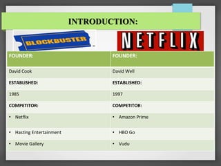 Blockbuster was founded in 1985 by David Cook and established over 5,000 video rental stores by the 1990s. However, the rise of streaming services like Netflix and online rental options from Amazon Prime caused Blockbuster's revenue to weaken. By 2010, Blockbuster had $1 billion in debt and filed for bankruptcy with the changing video industry and rise of digital competitors.