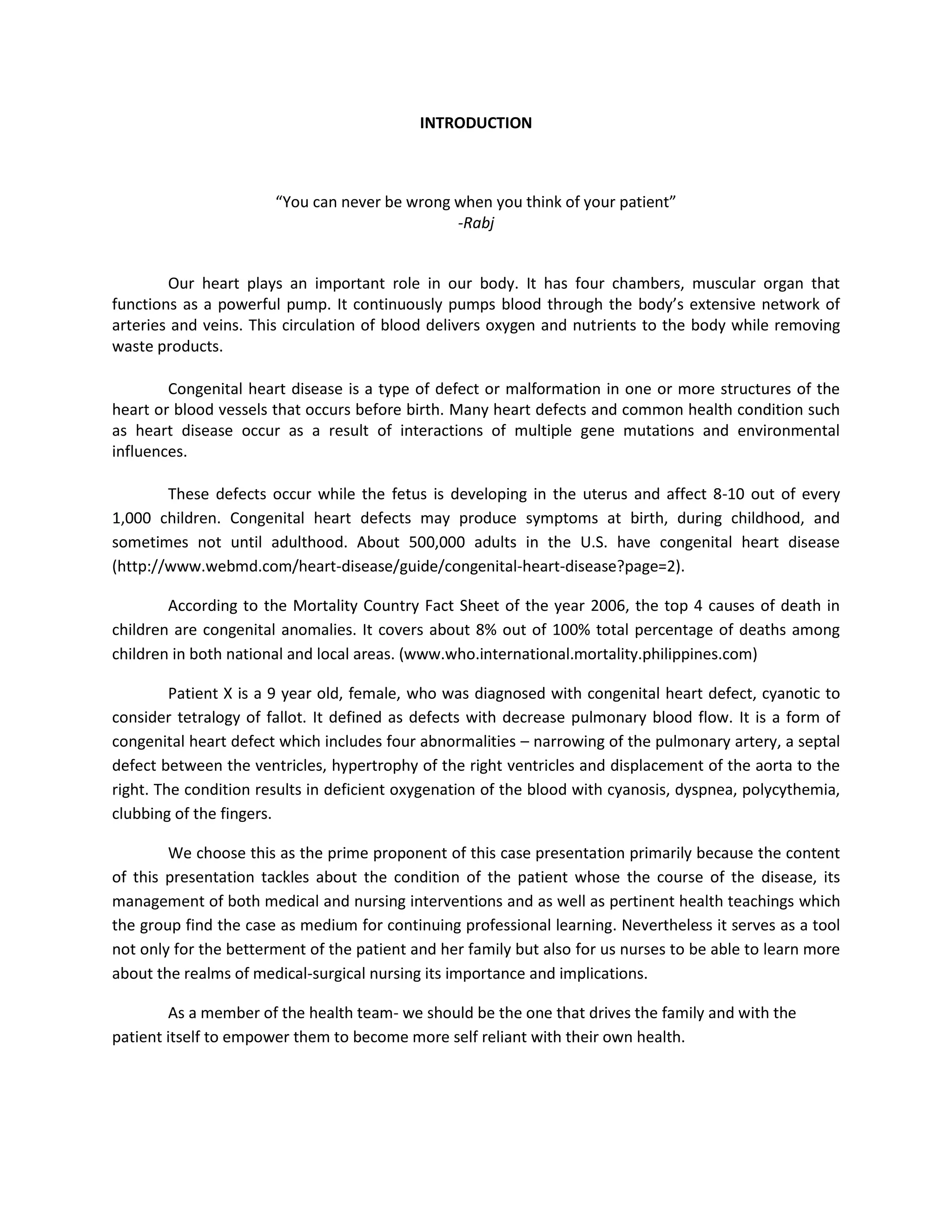 This document discusses congenital heart disease, specifically focusing on a 9-year-old female patient diagnosed with tetralogy of Fallot, a cyanotic congenital heart defect. It details the patient's medical history, current condition, and ongoing diagnostic work-ups, including nursing care and treatment plan considerations. The document aims to educate healthcare professionals on managing such cases and emphasizes the importance of family support and self-reliance in patient health management.