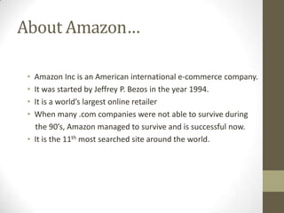 The document summarizes information about Amazon, including how it started in 1994 and has become the world's largest online retailer. It discusses how Amazon has succeeded when other online companies failed by welcoming new products, offering a wide range of products and easy selling options for suppliers. The document also presents three case studies: how Amazon succeeded online, whether the Kindle will revolutionize the book industry, and what the future may hold for Amazon, including that cloud computing is a good direction for the company to grow.