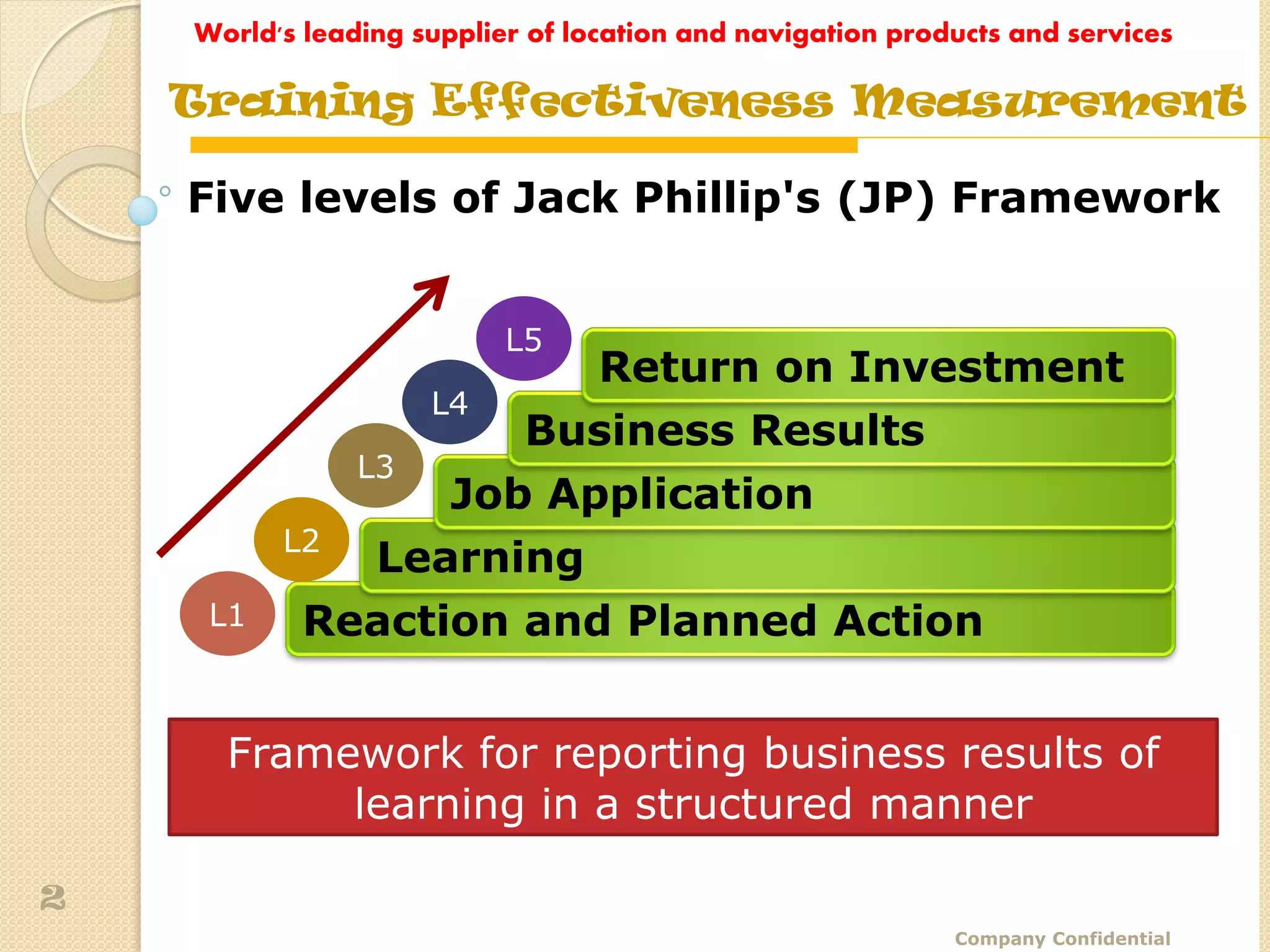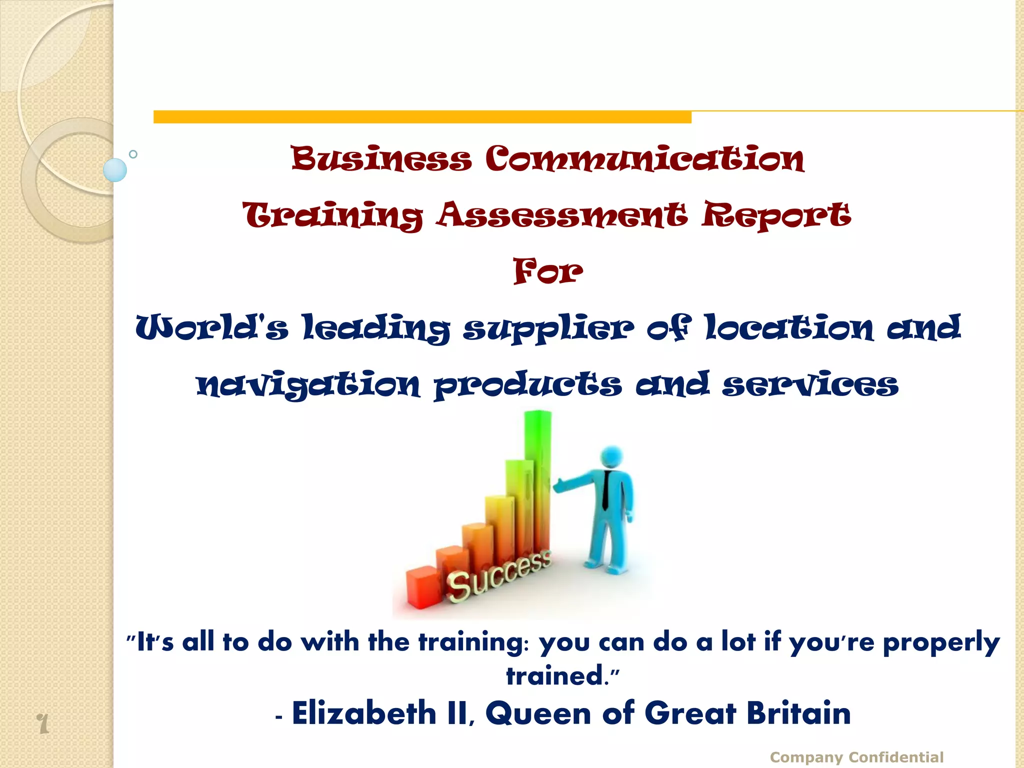 The document details a training assessment report for a leading supplier of location and navigation products, emphasizing the importance of effective training in business communication. It outlines a structured measurement framework based on Jack Phillips' five levels, covering various aspects of training effectiveness and participant feedback. The report highlights the course's success in improving communication skills, and suggests future assessments for continual improvement.