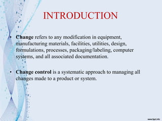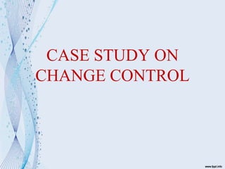 This document describes a case study on implementing change control for a Brookfield viscometer that was experiencing frequent spindle speed changes without human handling. This was affecting manufacturing processes and resulting in misleading viscosity readings. A change control process was initiated to address calibration intervals and validation procedures for the viscometer. Documentation was created justifying the need for the change and submitted to the quality assurance team for review and approval. Once approved, the change was implemented.