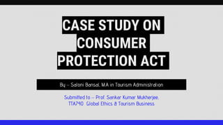 This document provides a summary of the Consumer Protection Act of 1986 in India including its objectives, who qualifies as a consumer, consumer rights, and the redressal process. It establishes three levels of consumer courts - district forums, state commissions, and a national commission. It also presents two case studies as examples. The first case study describes a dispute between Thomas Cook India and customers over deficient visa services that impacted their travel plans. The second case study awarded compensation to an individual and family after the death of their wife/mother due to lack of safety measures at an army-run boat club.