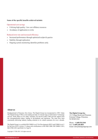 The document describes the Digital Group's work to improve the database organization of a leading local community-focused web application provider facing instability and performance issues due to rapid growth. Their solution involved a comprehensive database analysis and optimization process, which resulted in enhanced system performance, stability, and reduced operational costs without requiring a complete application re-write. The ongoing support and monitoring allowed the client to achieve an unmatched level of usability, thereby strengthening their market position.