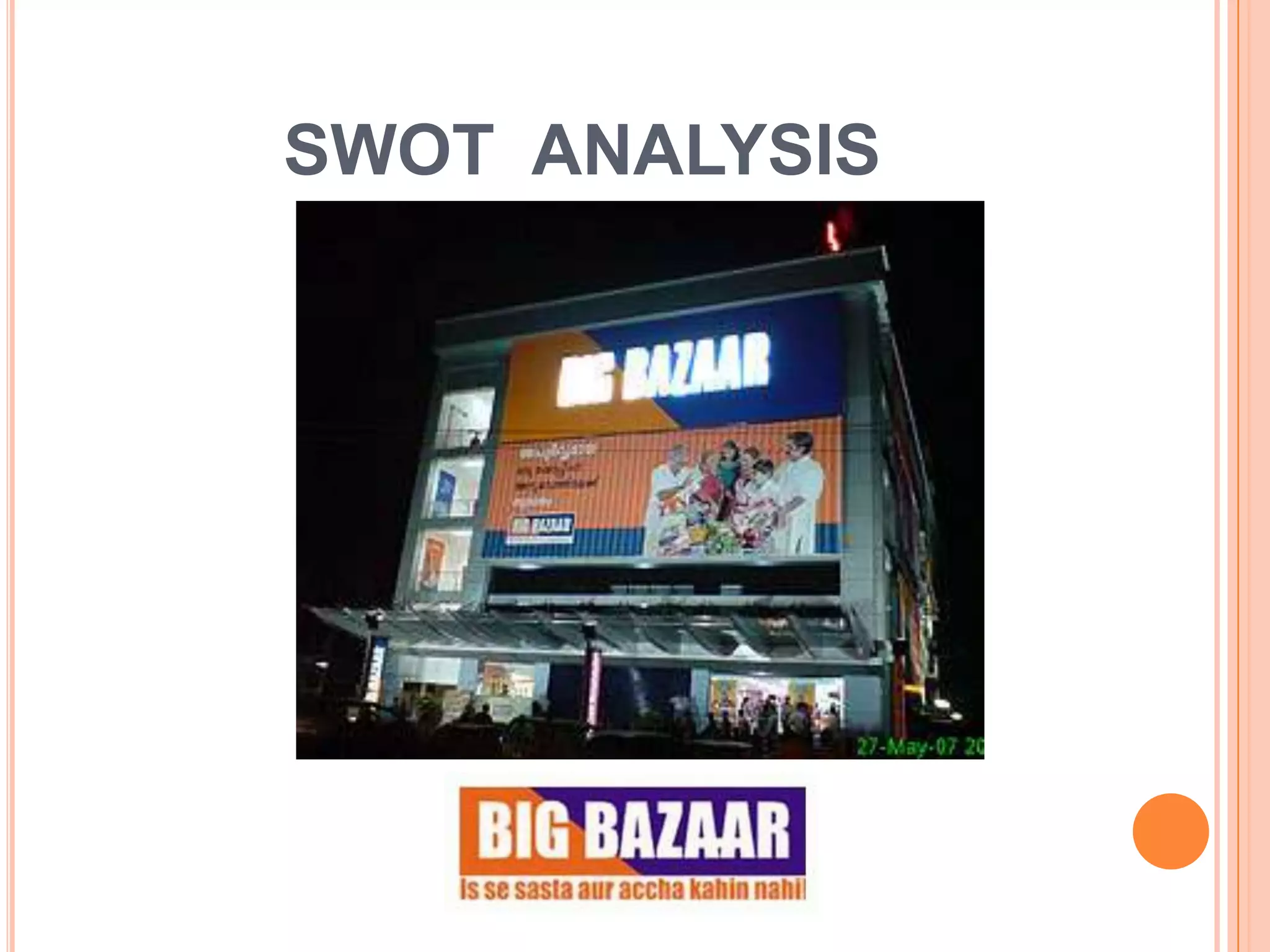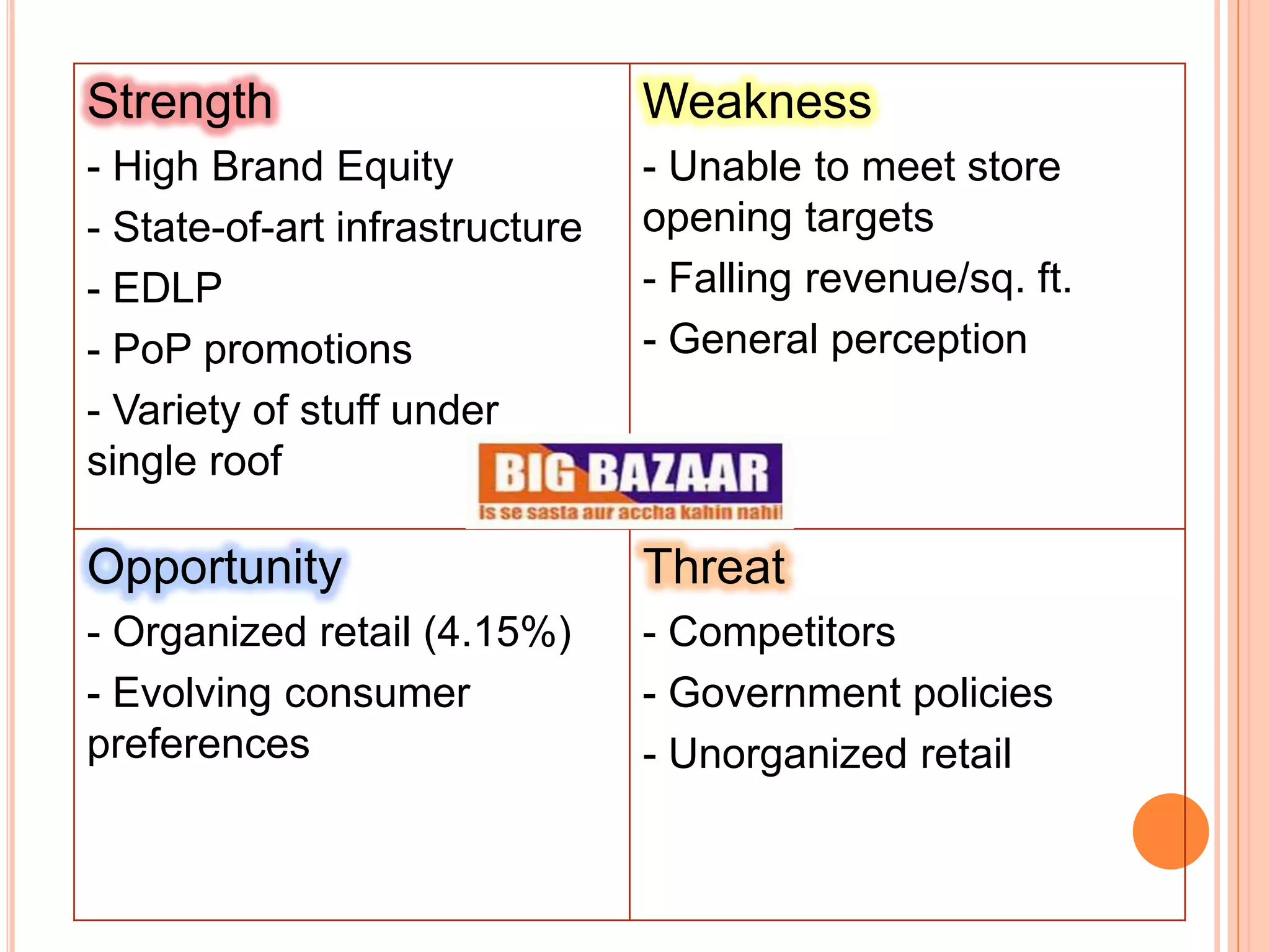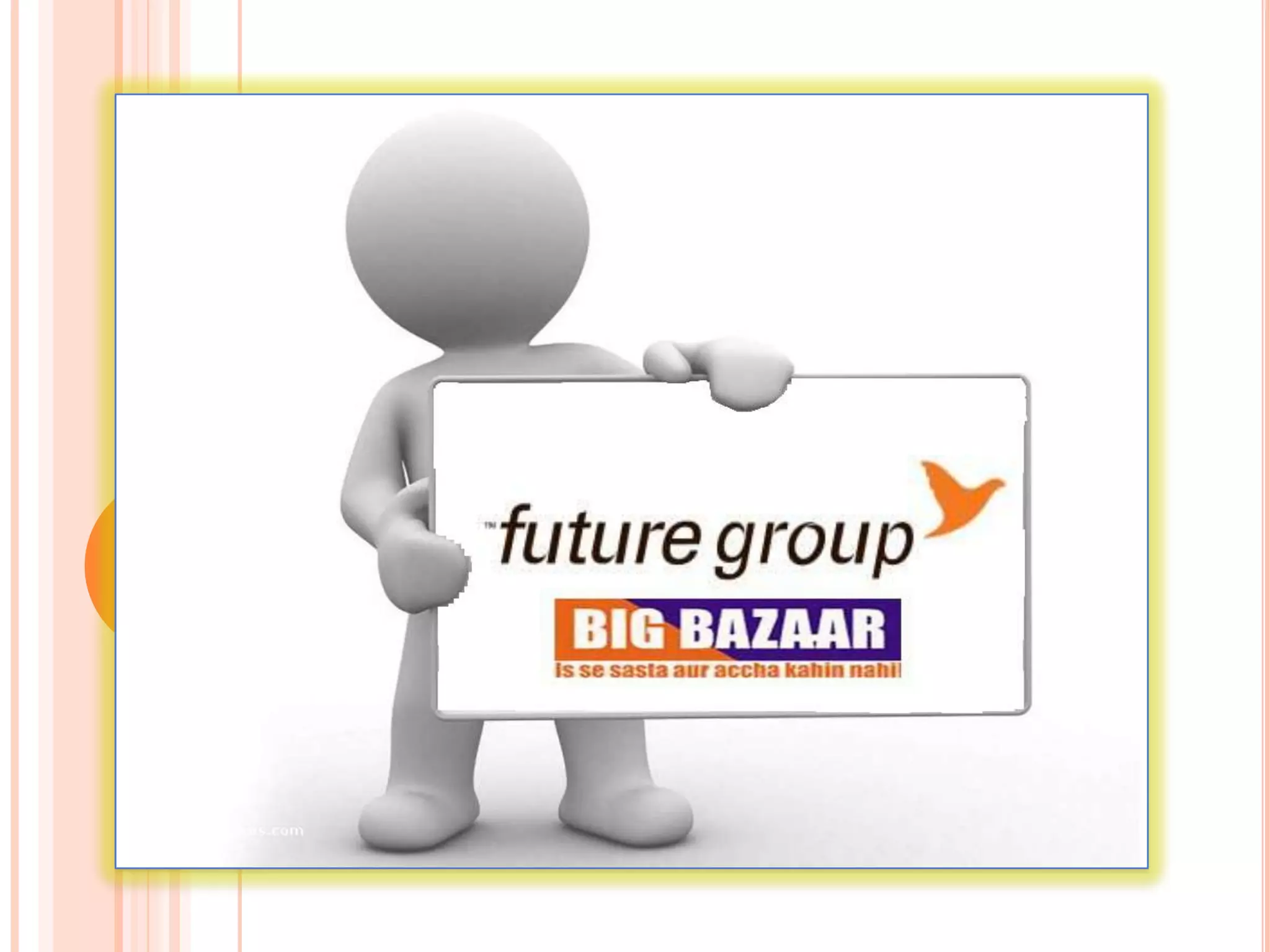 Big Bazaar is a hypermarket retail chain founded in India in 2001 by Kishore Biyani. It is part of the Pantaloon Retail India Limited and has over 83 outlets across India. Big Bazaar aims to deliver everything to every Indian consumer in the most profitable manner through a variety of promotional strategies and a growth in stores in recent years.
