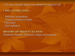 A 62-year-old male patient presented with difficulty breathing, frequent nighttime urination, chest pain, and tightness. Examinations found high blood pressure, low hemoglobin, and increased blood urea nitrogen. Tests showed the patient had heart failure due to reduced left ventricular function and vascular insufficiency from longstanding hypertension. The patient was diagnosed with heart failure and hypertension. Treatment included diuretics, beta blockers, and digoxin to improve heart function as well as lifestyle counseling regarding weight, fluid, and sodium management.