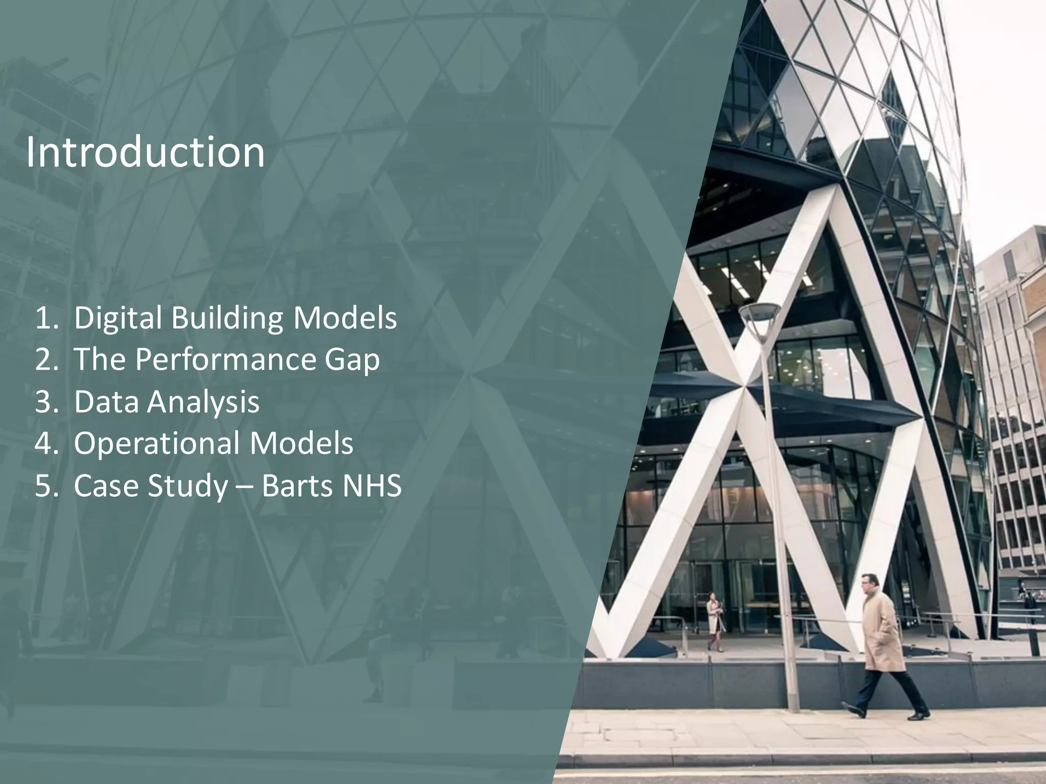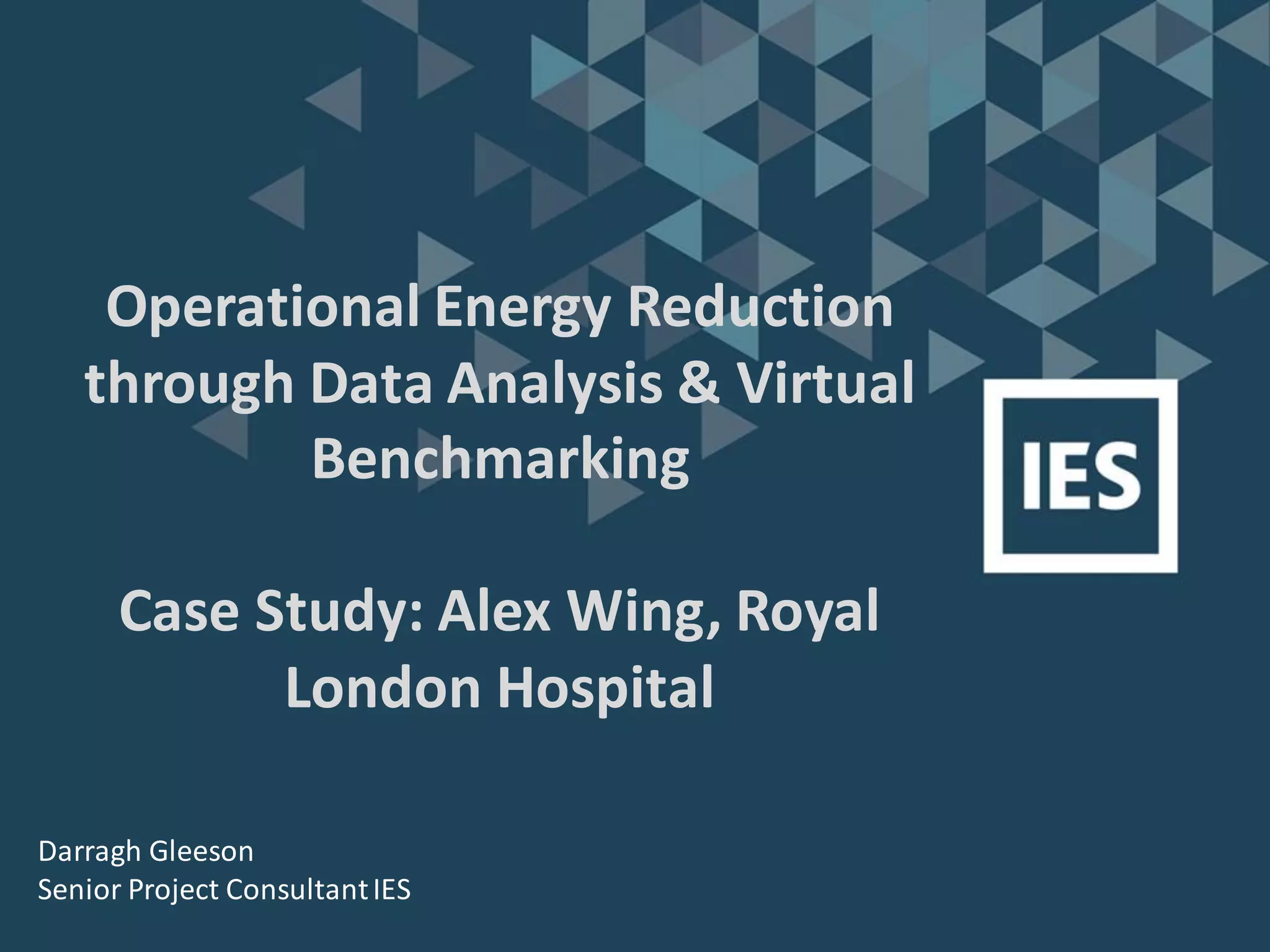 The document discusses the operational energy reduction achieved through data analysis and virtual benchmarking in a case study at Barts Health NHS, highlighting the performance gap between expected and actual building energy use. It emphasizes the importance of effective data management, calibration of operational models, and identification of energy conservation measures, resulting in significant reductions in gas and electricity consumption. Overall, the study indicates that energy cost and carbon emissions can be lowered through an integrated approach to data analysis and building performance optimization.