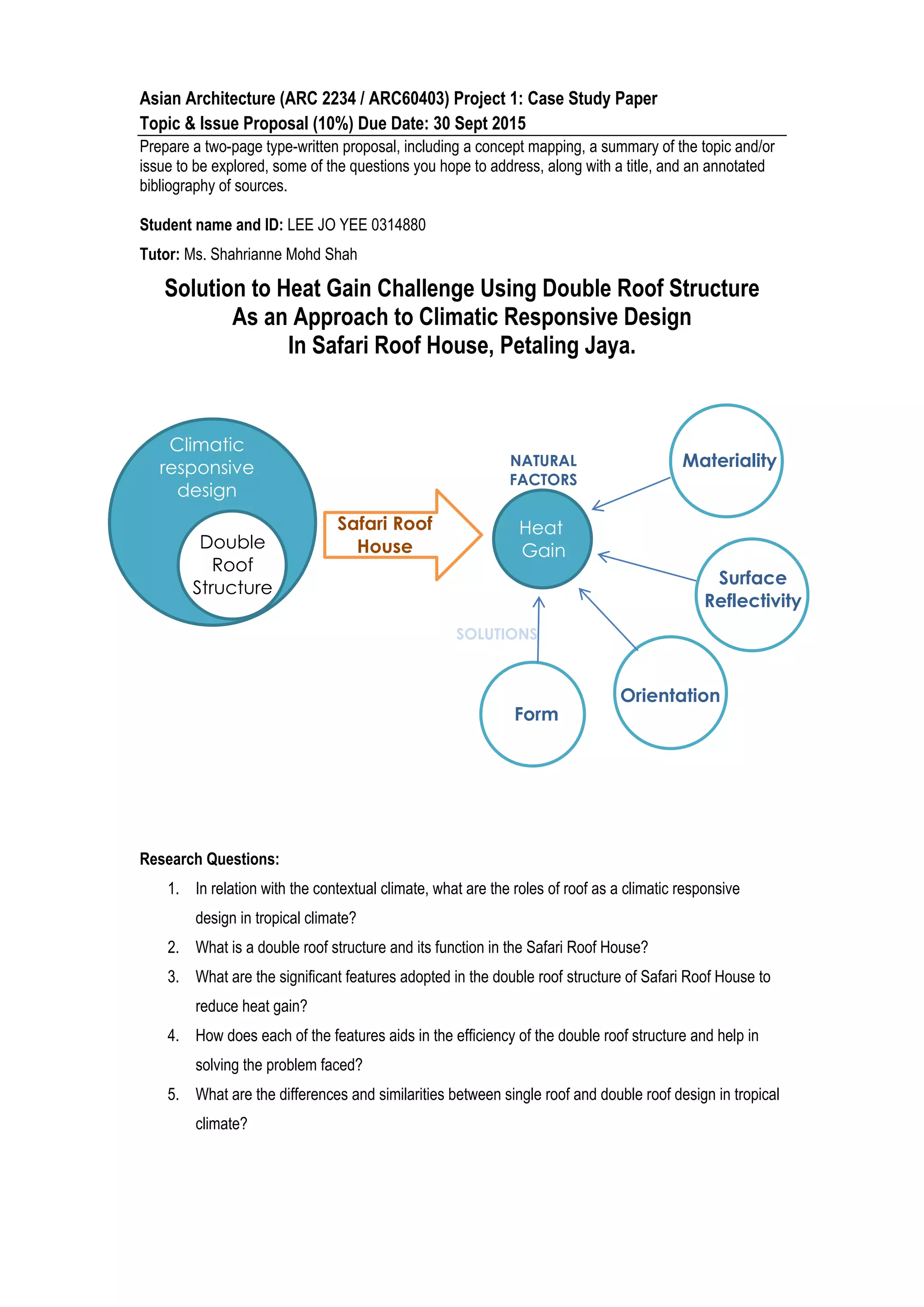 This document is a project proposal for a case study paper on the Safari Roof House in Petaling Jaya, Malaysia. The proposal provides background on the topic, which is the use of a double roof structure as a climate responsive design element in tropical architecture. It identifies several research questions, such as the roles of the roof in tropical climate, the functions of the double roof structure in the Safari Roof House, and the features that help reduce heat gain. An annotated bibliography provides sources on vernacular Malay architecture, details on the Safari Roof House, and climate responsive design strategies for warm-humid zones.