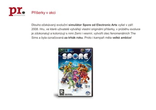 Příšerky v akciOdstartovaloji hravé setkání s novináři všech žánrů. Na „Spore Night“, kde se při různých soutěžích sami měnili pomocí doplňků a kostýmů v příšerky, jich dorazila téměř stovka. Zkusili si evoluci na vlastní kůži, pobavili se s námi a samozřejmě měli možnost si Spore přímo na místě i zahrát. Veselý večírek položil dobrý základ pro další intenzivní media relations a odrazil se ve výborném pokrytí v nejrůznějších typech médií.