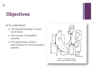 This case study describes a 31-year-old male with a history of Alport syndrome and kidney transplant who presented with acute renal failure secondary to transplant rejection. Key points include: the patient's medical history of ESRD due to Alport syndrome requiring dialysis and kidney transplant; presentation with elevated creatinine and signs of antibody-mediated transplant rejection; treatment involving immunosuppression medication and potential need for dialysis; and nutrition interventions focusing on meeting protein and calorie needs through a renal diet.