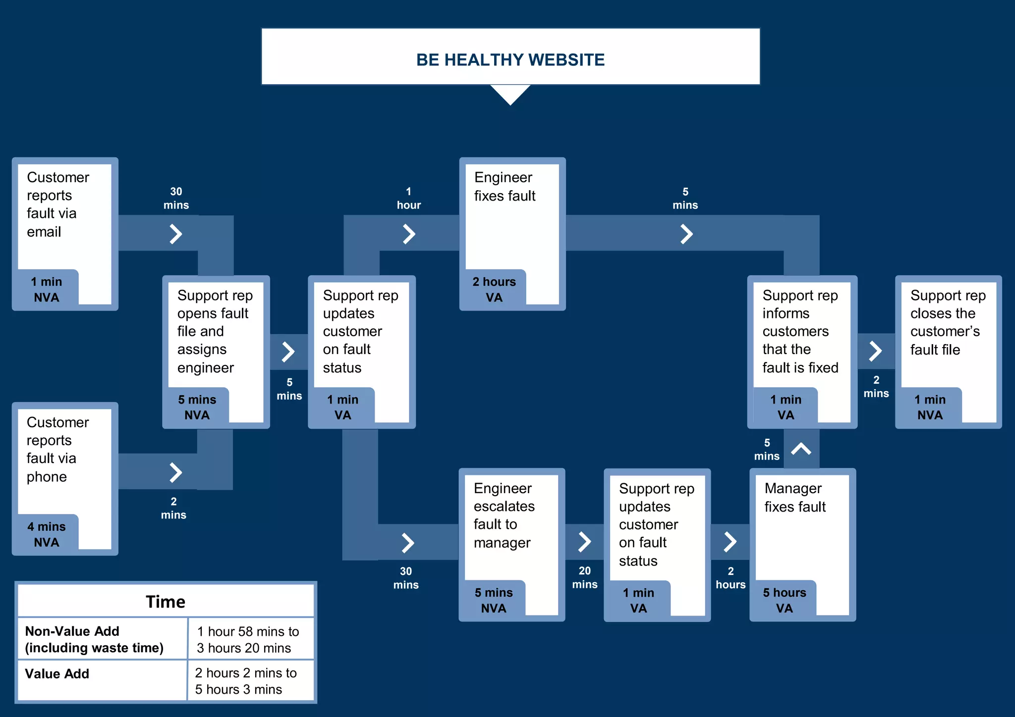 The document outlines various customer service and production processes, detailing both value-add and non-value-add times for each step. It includes examples from a fault reporting system, service booking process, and basic cake production, providing insights into inefficiencies. Additionally, it suggests using a provided template to create process maps that can help identify areas for improvement in operational efficiency.
