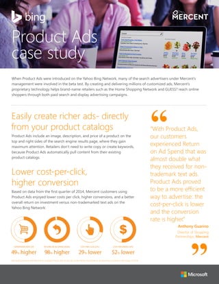 Mercent, a company that manages search advertising for retailers, helped several of its clients test Product Ads on the Yahoo Bing Network during the beta launch. Product Ads automatically pull product images, descriptions, and prices directly from retailers' catalogs to display on search results pages. Data from the first quarter of 2014 showed that Mercent customers experienced lower cost-per-click, higher conversion rates, and nearly double the return on ad spend compared to regular text ads on the Yahoo Bing Network when using Product Ads.