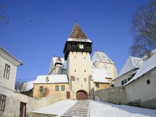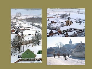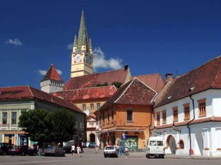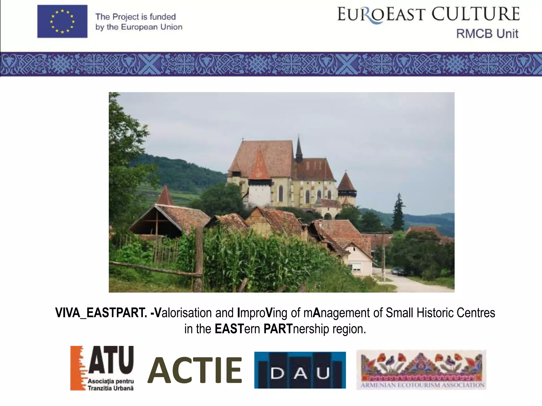 This document provides information about the VIVA_EASTPART project which aims to improve management of small historic centers in the eastern partnership region. It then summarizes statistics and details about the Sibiu county region of Romania, including its population breakdown and the main city of Sibiu. Several small villages in the region are also described, focusing on their fortified churches and cultural traditions. Local strategies and actors working to improve the area are listed at the end.