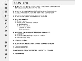 The document provides a detailed prototype study of the State Institute of Agriculture Management (SIAM) in Jaipur, focusing on various aspects such as site analysis, building functions, environmental considerations, and special services. It outlines the layout and design of the institute, including the administrative block, auditorium, hostel, and other facilities, along with their inter-relationships and sustainable practices. The study also includes elements like vehicular movement, space analysis, climate considerations, and user feedback to ensure optimal functionality and comfort of the institute's infrastructure.