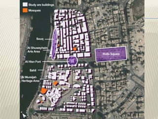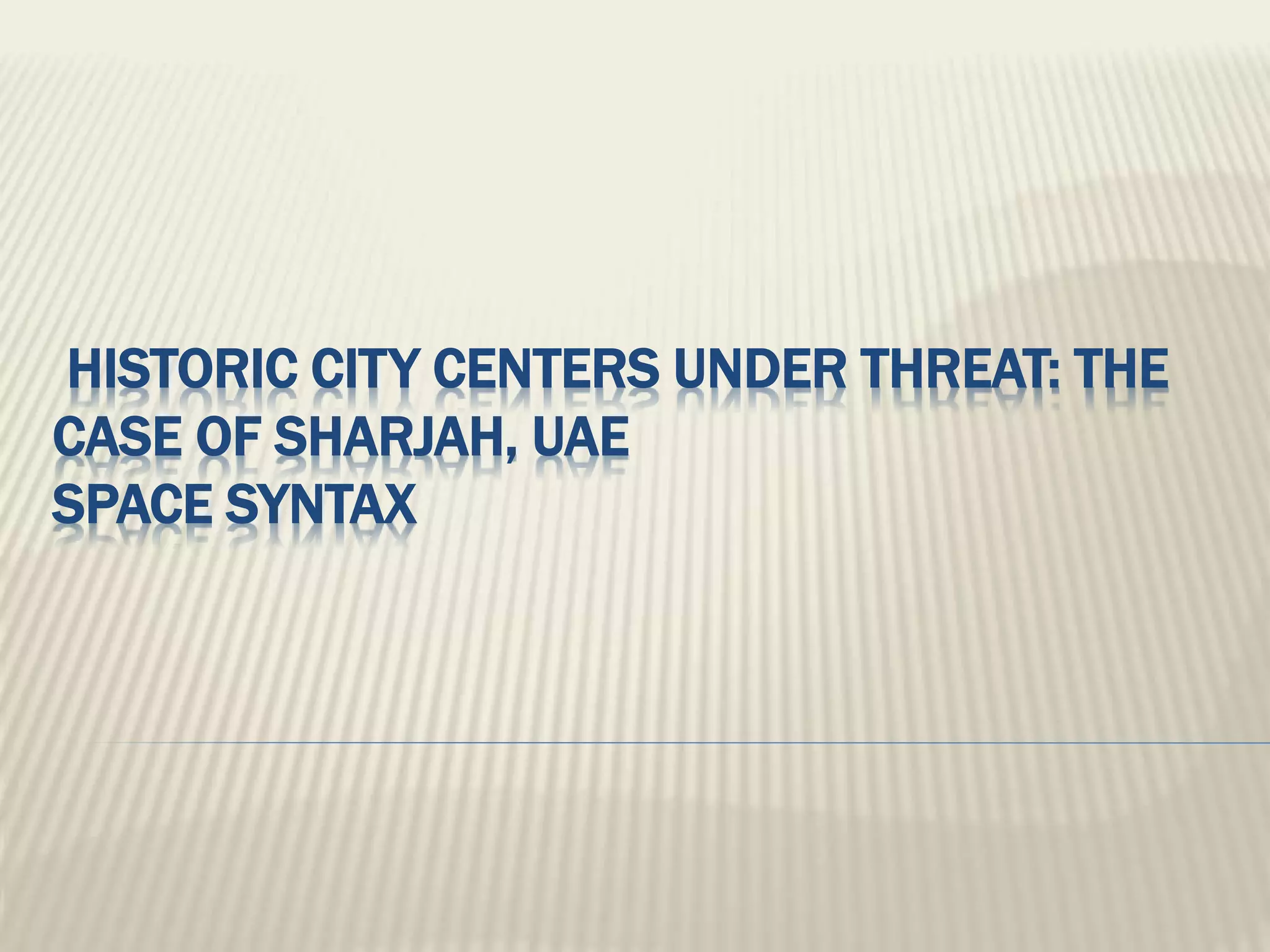 This document analyzes the spatial structure and issues facing the historic city center of Sharjah, UAE using space syntax methodology. It finds that the historic center was originally highly integrated and connected to the waterfront, but modern development has pulled the city inland and segregated the historic core. This has led to problems like traffic, environmental degradation, and the center becoming unattractive. The analysis identifies solutions like reconnecting the historic core to the waterfront and promoting active land uses to revitalize the area and preserve the cultural heritage.