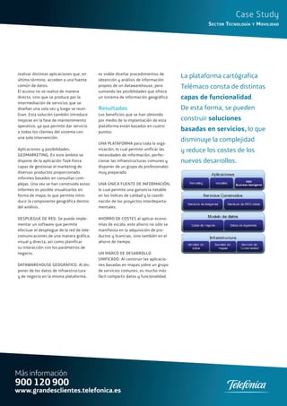 Telefónica implementó una plataforma de sistemas de información geográfica corporativos llamada Telémaco para unificar su información geoespacial. Telémaco permite visualizar datos de negocio sobre mapas, desarrollar aplicaciones basadas en servicios compartidos y lograr ahorros de costos. La plataforma proporciona beneficios como una única fuente de información geográfica, marco de desarrollo unificado y ahorro de costos.