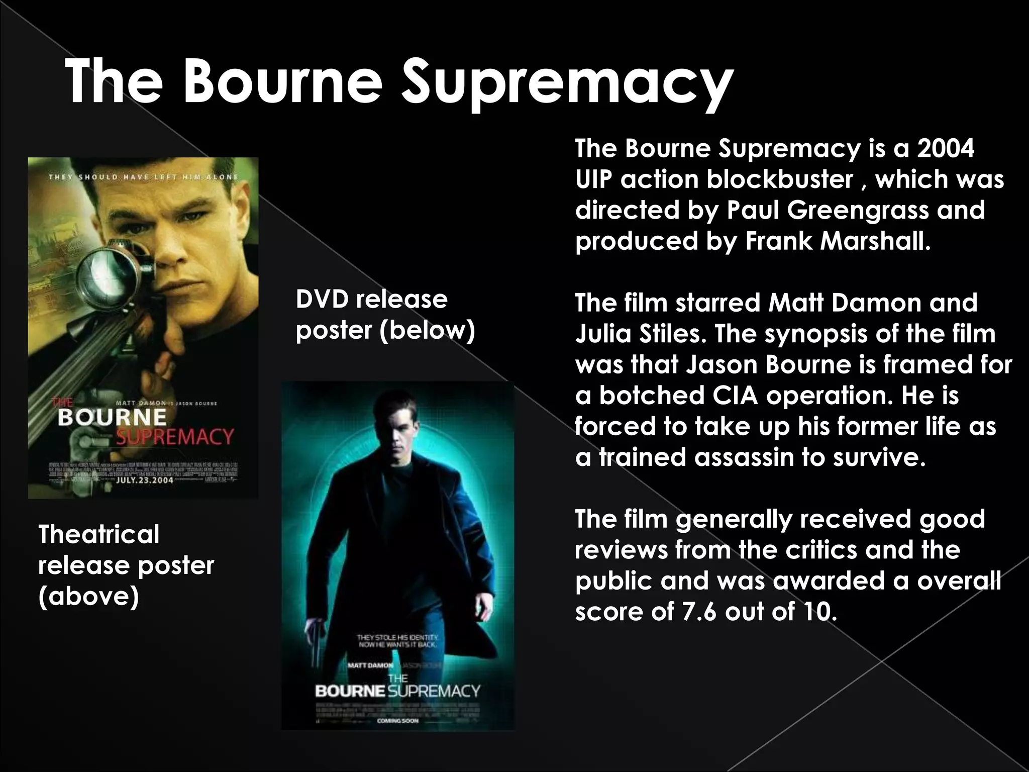 The Bourne Supremacy is a 2004 action thriller and sequel to The Bourne Identity. It stars Matt Damon as Jason Bourne, who is framed for a botched CIA operation. Forced to take up his former life as an assassin to survive, Bourne must clear his name. The film received positive reviews from critics and audiences. Its marketing campaign, which included TV spots and merchandise, was successful in attracting the target 16-34 male audience and grossing over $288 million worldwide, more than the original film.
