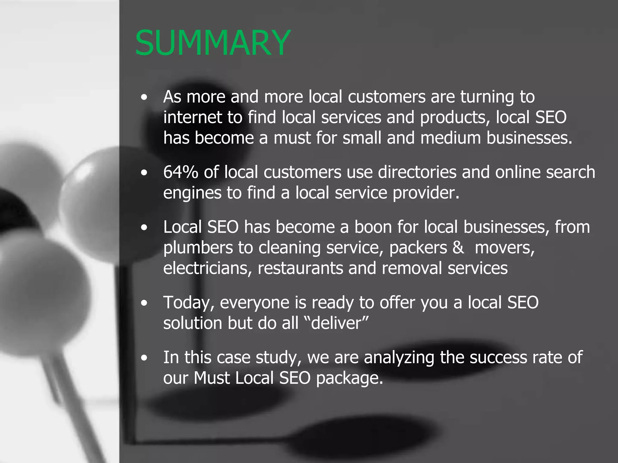 This case study examines the effectiveness of a local SEO package for three business clients. It outlines the on-page and off-page optimization strategies used, including keyword research, website updates, local business listings, social media marketing, and link building. Results after six months included improved search engine rankings, a large increase in daily leads, and transformed businesses driving more customers outside their local areas. All three clients were very satisfied with transformed search visibility and increased returns on their investment.