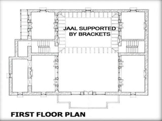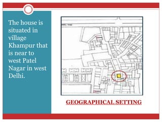 This document provides a case study of a traditional building located in the village of Khampur near West Delhi. It summarizes the building's geographical setting, layout, construction details, and passive climate control strategies. The two-story building is organized around a central courtyard, with the ground floor used by males and outsiders and the private family areas on the first floor. Thick stone walls, openings, and a courtyard promote air flow for cooling in the composite climate. The building demonstrates traditional construction methods and the influence of local culture and environment on building design.