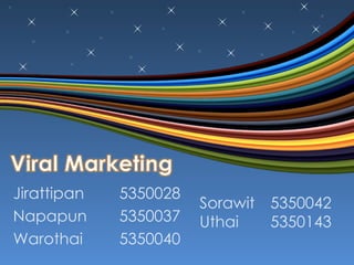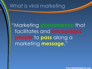The document discusses viral marketing, defined as a phenomenon that encourages people to share marketing messages. It highlights various channels, such as e-mail and video marketing, and provides examples including Hotmail's rapid user growth and Blendtec's successful viral video campaign. Additional examples include the social phenomenon of 'planking,' which gained notoriety in Australia after its association with a rugby player and subsequent tragic events.