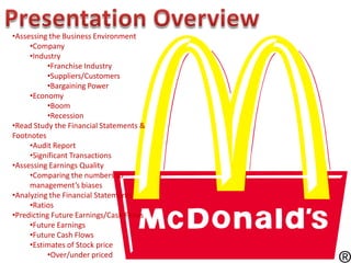 McDonalds began in 1940 and was sold to Ray Kroc in 1955, becoming a publicly traded company. It is now the largest fast food chain globally with over 31,000 locations in 119 countries. McDonald's operates mainly as a franchisor, with over 25,000 franchised locations and the remainder company owned. The presentation analyzes McDonald's business model and financial statements, identifying main competitors and global expansion. Ratios are used to assess profitability, leverage, solvency, asset turnover, and other financial metrics. Future earnings and cash flows are predicted to remain strong, allowing continued growth and dividend payouts.