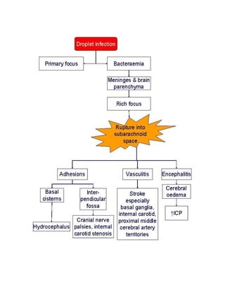 1) TB meningitis is caused by Mycobacterium tuberculosis infection of the meninges and results in inflammation concentrated at the base of the brain.