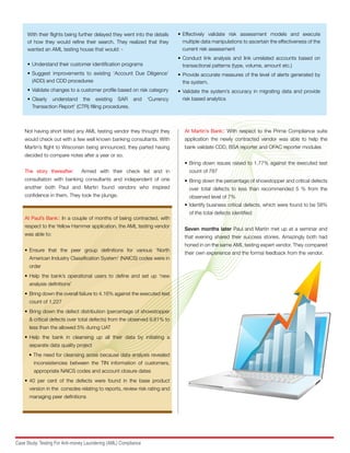 Paul Reuben and Martin Chipperfield, managers at two different banks, discussed their need to find an independent testing house to thoroughly test their banks' anti-money laundering systems and ensure compliance. They both ended up selecting the same vendor, Thinksoft Global Services, who was able to identify defects, help improve data quality, and validate that the systems met regulatory requirements like know-your-customer procedures. The vendor overcame challenges like limited access and timeframe to deliver thorough testing that satisfied both banks.
