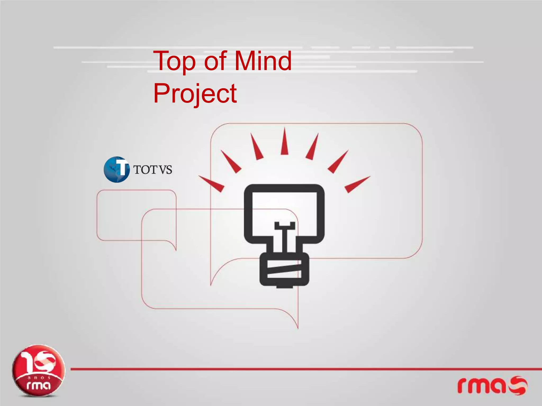 TOTVS is the largest applications software company in emerging markets and the 6th largest worldwide, with a 48.6% market share in Brazil and 34.5% in Latin America. It provides solutions to 26,000 active clients across 10 market segments in 23 countries. The Top of Mind Project aims to position TOTVS as a leader in its operating segment through communication of its offerings across segments, establishing press channels with investors, clients, and the market, as well as researching client perception and implementing an action plan to address gaps.
