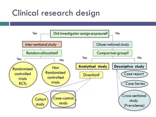 This document discusses case-control studies, a type of observational research focused on identifying associations between exposures and diseases through retrospective comparisons of cases and controls. It outlines potential biases in the selection of cases and controls, highlights the importance of precise definitions to avoid misclassification, and describes the interpretation of odds ratios as a measure of association. The document also emphasizes the strengths and weaknesses of case-control studies and includes examples of how different studies are designed and evaluated.