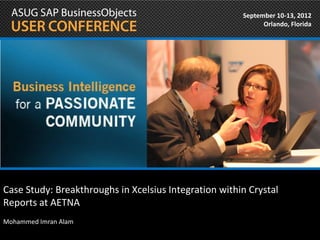 This document summarizes a presentation given by Mohammed Imran Alam of ActiveHealth on integrating Xcelsius and Crystal Reports. The presentation covered using the OpenDocument method for hierarchical drilldowns, creating list of values (LOVs) using universe prompts, customizing parameters in Crystal Reports, and tips for improving performance. Integration methods discussed included using Flash variables, XML variables, and the Crystal data consumer. The presenter provided resources and emphasized using dynamic sorting, wildcards in prompts, and the OpenDocument method for drilldowns and hyperlinks.