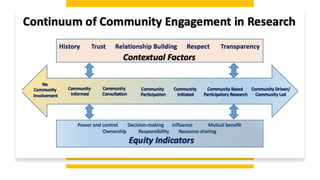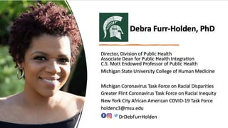 This document summarizes a presentation about structural inequities and their disproportionate impact on children. It discusses key concepts like disparities versus inequities, equality versus equity, and race versus racism. It also examines how COVID-19 disproportionately affected minority groups. The presentation identifies gaps in current approaches, such as an overemphasis on personal responsibility. It outlines future directions, like how to better track disparities, close the research-to-practice gap, and make equity a priority from the beginning. Barriers to achieving equity are discussed, along with parting words of wisdom for community members.