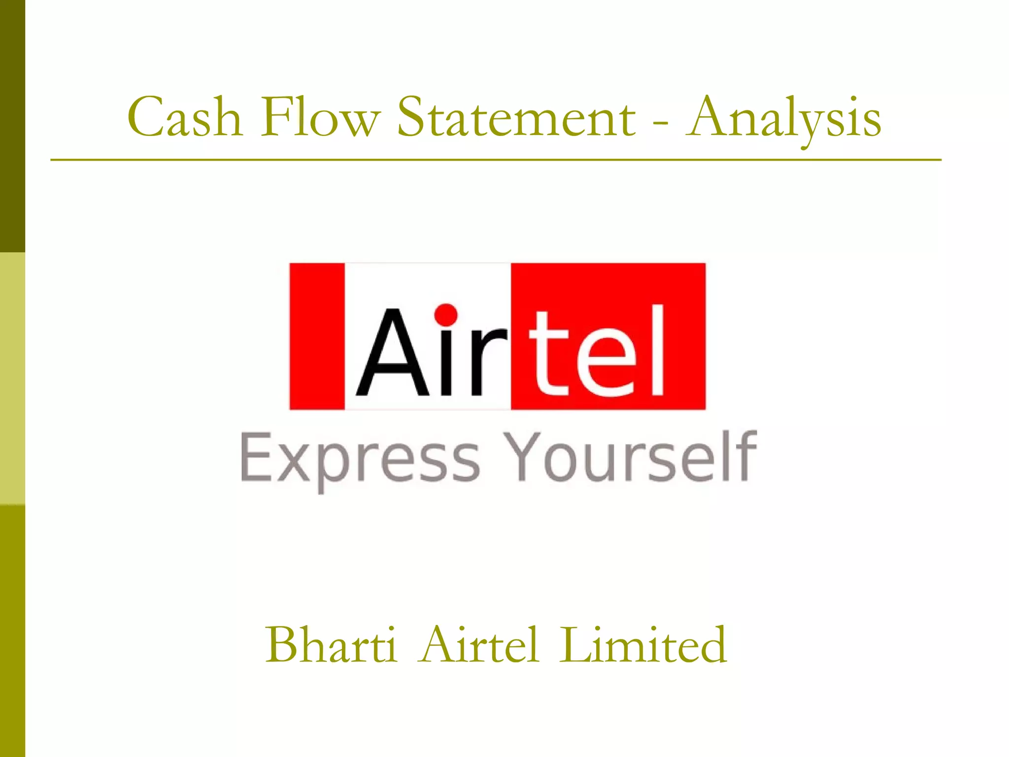 This document provides an analysis of the cash flow statement of Bharti Airtel Limited for the fiscal year 2008-2009. It begins with an overview of what a cash flow statement is and how it is divided into operating, investing, and financing activities. The document then examines Airtel's cash flow statement in detail, analyzing sources and uses of cash across the different activity categories and answering relevant questions about the company's liquidity, debt versus equity, and ability to fund purchases.