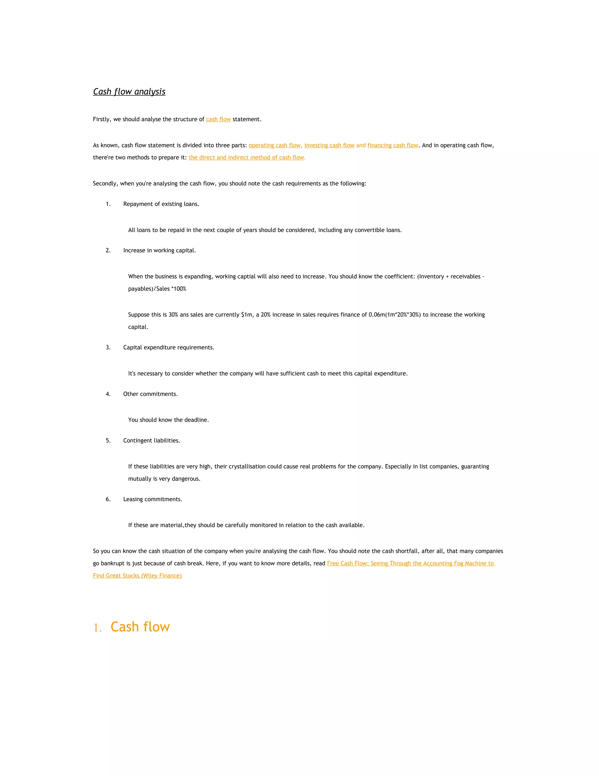 Cash flow analysis involves analyzing a company's cash flow statement, which is divided into three parts - operating, investing, and financing cash flows. When analyzing cash flow, key items to examine include repayment of loans, increases in working capital due to business expansion, capital expenditure requirements, other commitments, and contingent liabilities as insufficient cash flow is a major reason why companies go bankrupt.