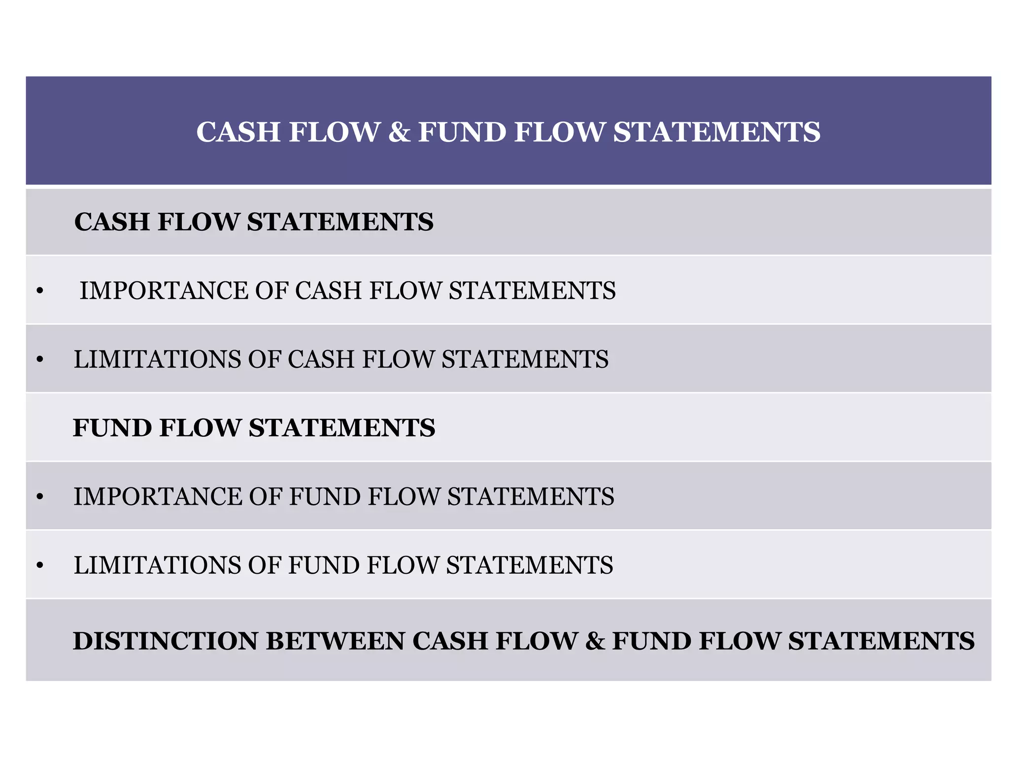 The document outlines the differences and similarities between cash flow statements and fund flow statements, emphasizing their importance, limitations, and uses in financial analysis. Cash flow statements focus on cash inflows and outflows, while fund flow statements analyze changes in working capital, providing insights into financial operations. Both types of statements serve as essential tools for short-term and long-term financial decision-making, though they each have distinct characteristics and limitations.