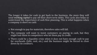 Cash flow refers to the movement of money in and out of a business over time. While a business may be profitable, it can still experience cash flow problems if it does not have enough cash on hand to cover expenses. This can occur if customers take too long to pay, assets are purchased all at once, or inventory is expanded too quickly. The document then provides an example cash flow statement that shows a business becoming overdrawn in May due to higher cash outflows than inflows that month. To remedy short-term cash flow issues, businesses can delay some payments, negotiate longer credit terms, or take out loans until cash flow improves. Maintaining adequate working capital is important for businesses to stay liquid and pay short-term debts