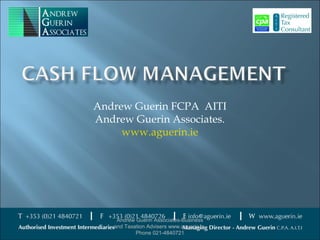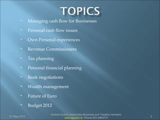 The document discusses cash flow management for businesses. It provides tips on managing cash flow through debt collection, payment of suppliers, monitoring inventory levels, and reducing costs. The document emphasizes creating a cash flow forecast to anticipate potential cash shortages. Overall, the document provides advice to businesses on improving cash flow through better management of sales, debtors, inventory, costs and financial planning.