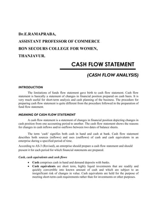 The document discusses cash flow statements, including their meaning, classification of cash flows, and uses. It defines a cash flow statement as a statement showing sources and uses of cash and cash equivalents over a period of time. Cash flows are classified into three categories: operating, investing, and financing activities. A cash flow statement is useful for short-term financial analysis and cash planning.