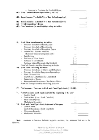The document presents a format for preparing a cash flow statement according to Accounting Standard 3 (Revised). It includes sections for cash flow from operating, investing and financing activities. Cash flow from operating activities involves calculating cash generated or used by adjusting net profits for non-cash/non-operating items and changes in working capital. Cash flow from investing tracks cash from the sale and purchase of fixed/intangible assets and investments. Cash flow from financing includes cash from issuing/repaying debt and paying dividends. Worked examples are provided to illustrate how to prepare a cash flow statement using the direct and indirect methods.