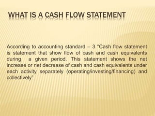 The cash flow statement summarizes the cash inflows and outflows for A Ltd. for the year ended March 31, 2012. It shows that cash from operating activities was Rs. 40,000, which was primarily from net profit adjusted for depreciation. Cash used in investing activities was Rs. Nil. Cash from financing activities was Rs. Nil as bank loan repayment was offset by dividend payment. Overall, cash and cash equivalents increased by Rs. 8,000 to Rs. 30,000.