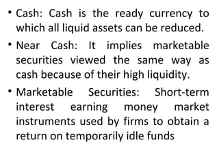 Cash management is important for working capital management. There are four motives for holding cash: transaction, precautionary, speculative, and compensating. The objectives of cash management are to meet payment schedules and minimize idle cash balances. Cash needs depend on the synchronization of cash inflows and outflows. Forecasting cash flows helps anticipate surplus or deficit periods to avoid issues like late payments or idle surplus cash. Cash can be forecast over different time periods using receipts/disbursements or adjusted net income approaches.