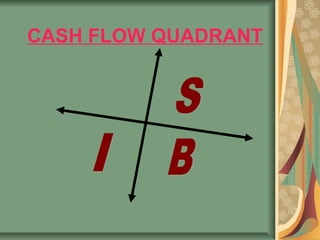 This document discusses Robert Kiyosaki's Cash Flow Quadrant model, which categorizes people into four quadrants based on how they earn income: E (employee), S (self-employed), B (business owner), and I (investor). It explains the core values of each quadrant and notes that most people fall into the E and S quadrants, where their income relies on their own labor and would stop if they stopped working. In contrast, those in the B and I quadrants can generate ongoing income without working due to business ownership and investments. It argues that network marketing presents an opportunity to transition from the E/S quadrants to the B quadrant by building a large network-based business with unlimited income potential