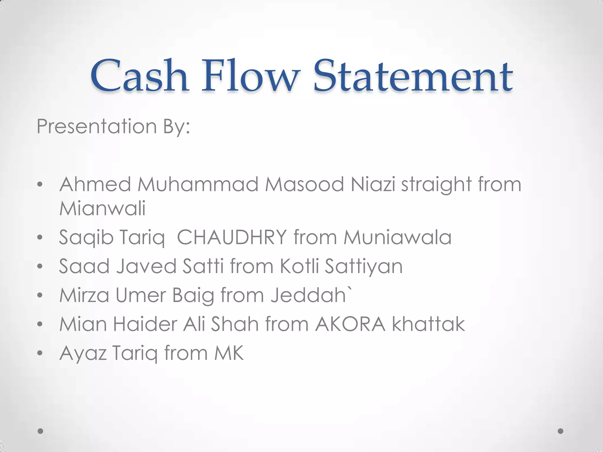 This document provides an overview of how to prepare a cash flow statement. It discusses the three sections of a cash flow statement - operating, investing, and financing activities. It explains how to classify items as cash inflows and outflows and the key adjustments needed to convert net income to cash flow from operating activities using the indirect method. Examples are also provided to illustrate how to calculate cash flow for each section.