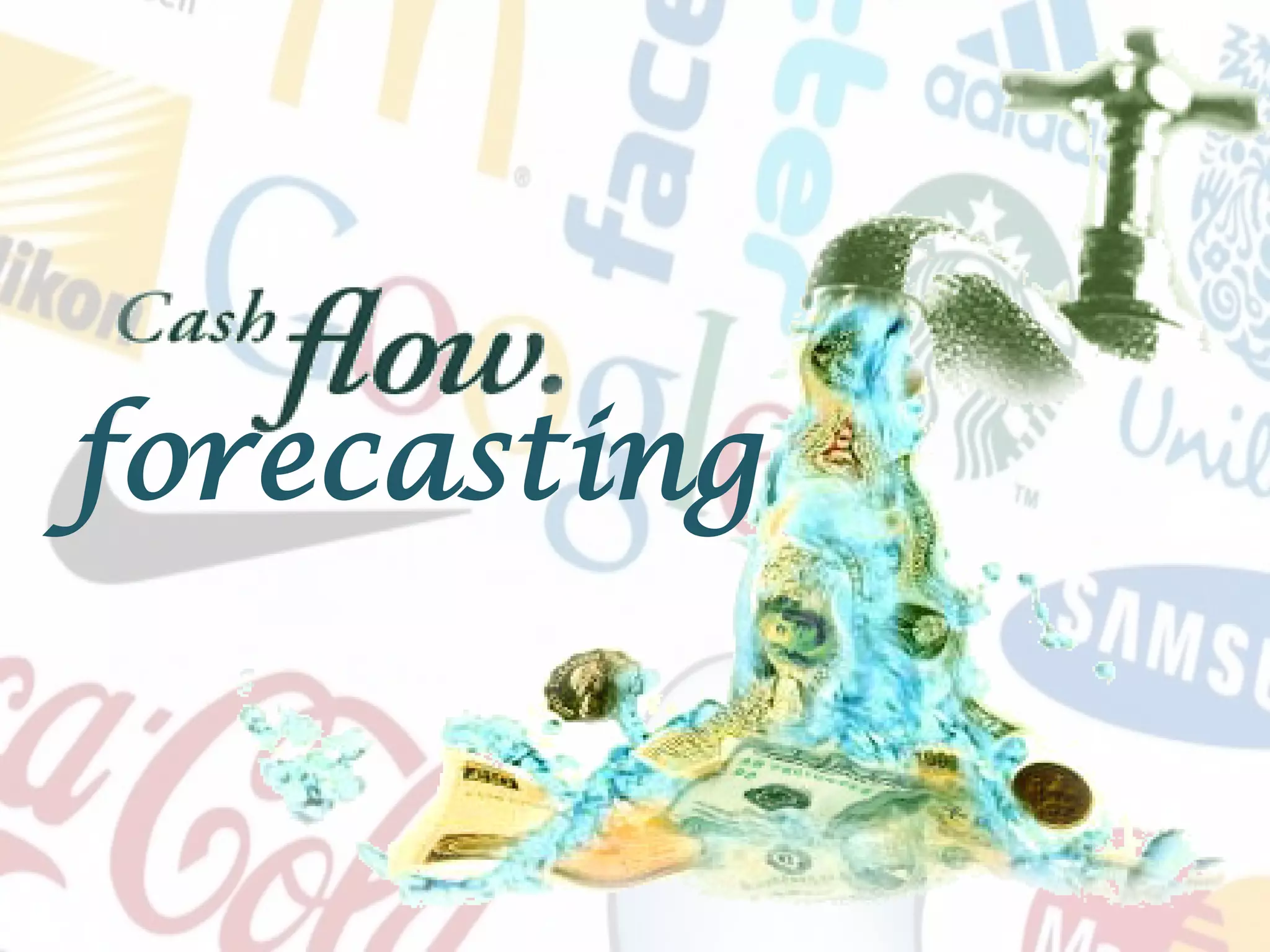 Cash flow forecasting predicts a business's future cash inflows and outflows. Cash flow forecasts are particularly important for new businesses, fast-growing businesses, and businesses with erratic sales to help plan for and manage cash needs. A cash flow forecast contains elements such as predicted monthly sales revenue (receipts), expected expenses (payments), the net difference between receipts and payments, an opening balance carried over from the previous month, and a closing balance. The document provides an example cash flow forecast for a business owner named Mr. Flake.