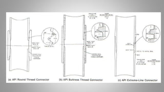 This document provides information about casing pipes used in oil and gas wells. It discusses the different types of casing including conductor casing, surface casing, intermediate casing, and production casing. Each type of casing serves a specific purpose like maintaining hole integrity, isolating pressure zones, and protecting groundwater. The document also covers casing connection types, sizing standards, recommended lengths, and potential causes of leaks.
