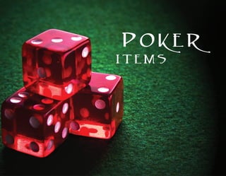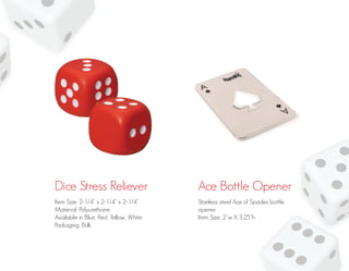 The document details a variety of promotional products related to gambling and casino themes, including stress relievers, bottle openers, card holders, and mint tins. It provides specific dimensions, materials, colors, and packaging details for each item, emphasizing their suitability for sports and gaming events. The items range from card decks to novelty keychains, catering to different promotional needs.