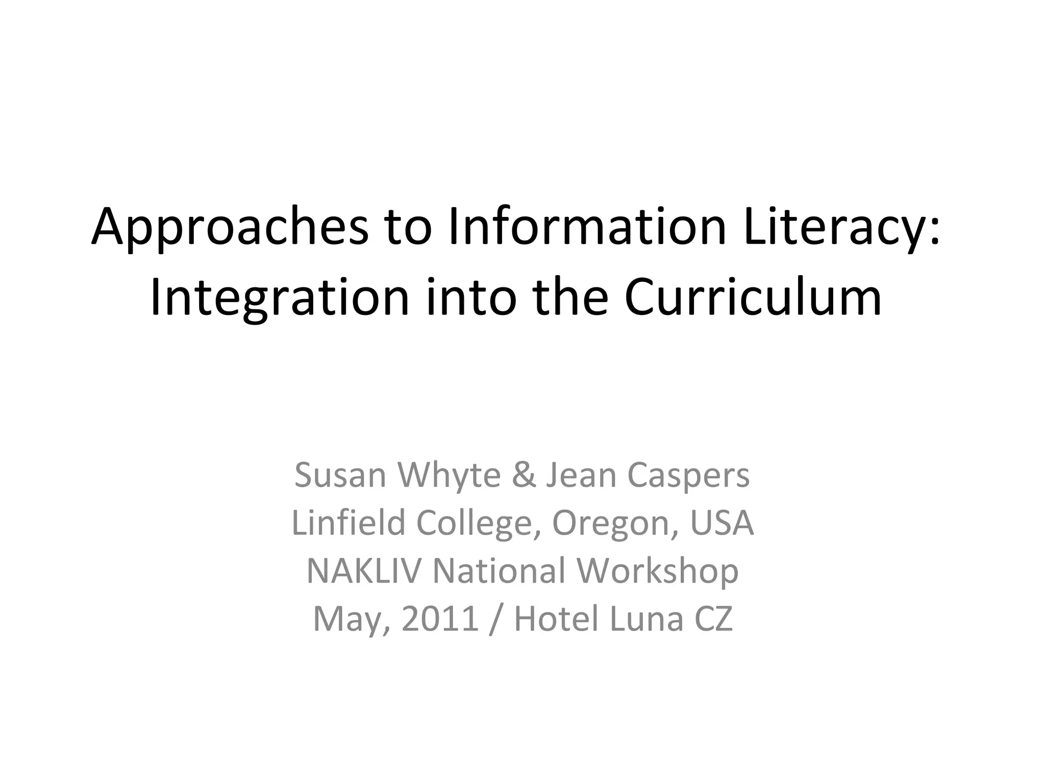 The document summarizes the integration of information literacy into the curriculum at Linfield College in Oregon. It discusses leveraging relationships through vertical integration from first year to graduation and horizontal integration in upper division and capstone courses. It also discusses stand-alone library classes taught and deep integration of information literacy into the college's INQS program. Examples of research paper topics used in information literacy instruction are also provided.
