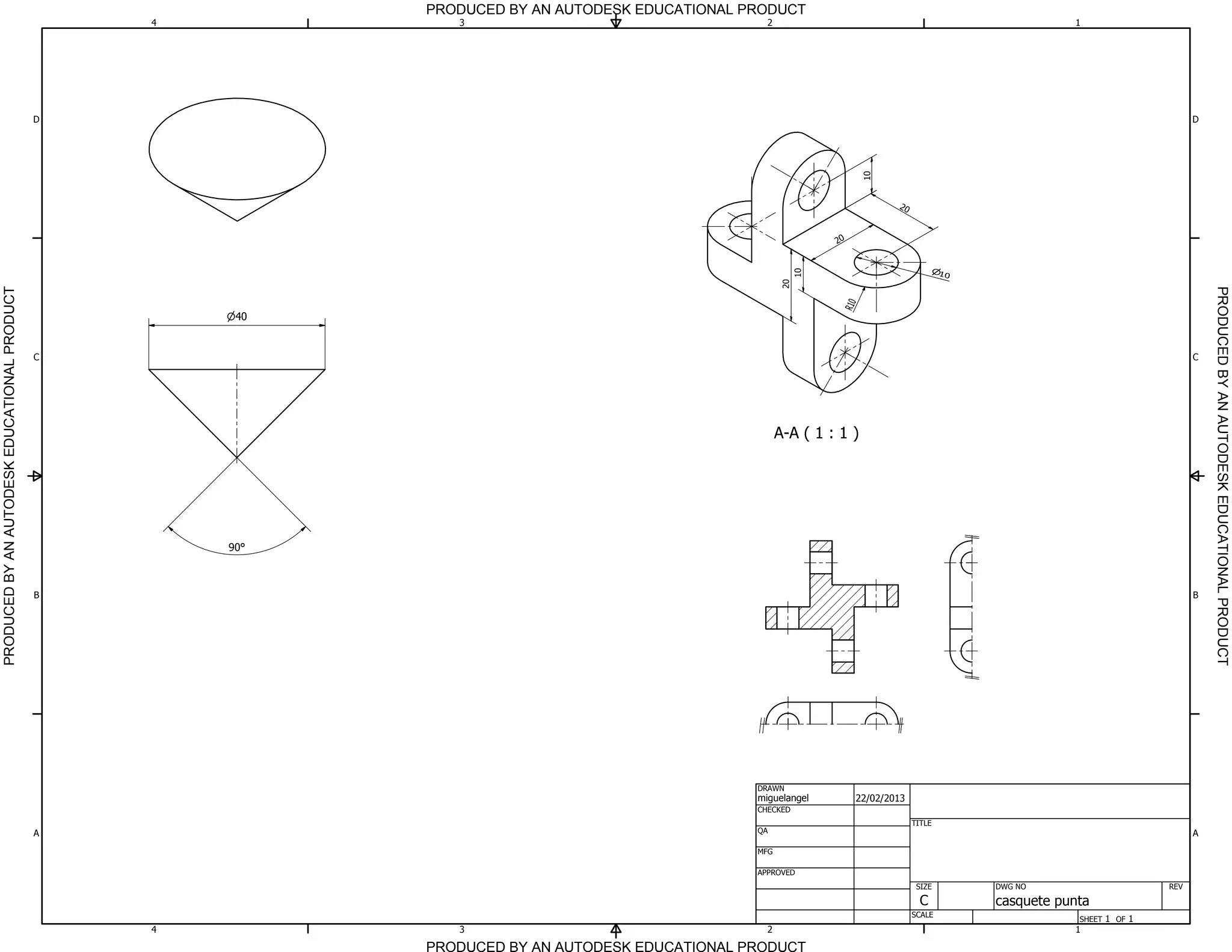The document shows a technical drawing of a cap or cone-shaped part. It includes views from different angles with labeled dimensions. The drawing also contains title block information indicating it was created by an Autodesk educational product for a part called "casquete punta".