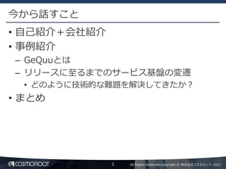GeQuuの読み方は「じくー」です。 – よく「げくー」と間違えられますが…。 – Geolocation/GeomediaのGeです。 – 読み方を元に、空いているTwitterアカウントを 探してたらこのスペルになりました。 • 今年8月から公開ベータを開始しました! – Androidクライアント公開中。 – iPhoneクライアントは現在開発中。 10 All Rights Reserved,Copyright © 株式会社コスモルート 2011