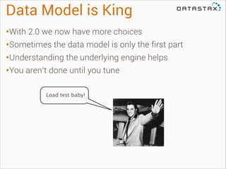 The document discusses the enhancements in data modeling and performance optimization in Cassandra 2.0, emphasizing the importance of a well-structured data model for achieving better read latencies. It details the use of light-weight transactions (LWT) to handle edge cases during write operations and presents examples of form versioning strategies. The document also highlights the significance of measuring and testing data models under real-world conditions for improved performance outcomes.