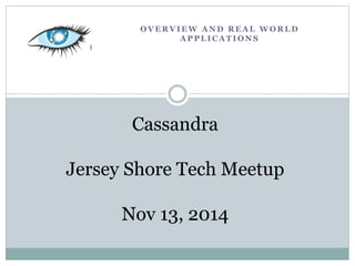 The document provides an overview and discussion of Cassandra including its architecture, data model, and real world applications. It discusses Cassandra's distributed architecture based on BigTable and Dynamo, as well as key concepts like nodes, clusters, consistency levels, and tunable consistency. The document also covers data modeling techniques in Cassandra like compound primary keys, materialized views, secondary indexes, counters, and using time to live for expiring data. Real world examples are provided for many of these techniques.