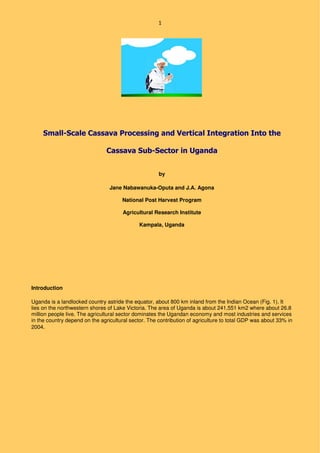 1. This document summarizes a project in Uganda that aimed to improve small-scale cassava processing and integrate cassava production into related industries. The project established pilot processing sites, trained farmers in improved production and processing techniques, and facilitated marketing groups.
